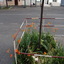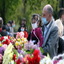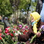 A woman sells flowers against the backdrop of concrete barricades in Odesa